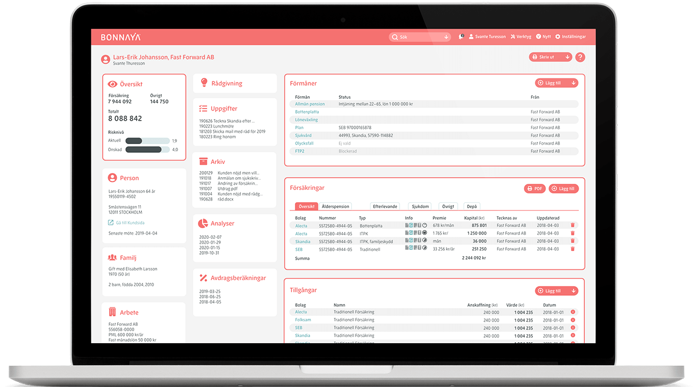 Bonnaya är det enda verktyg du behöver för rådgivning inom finans, försäkring och pension. All information på ett ställe ger dig en fin överblick över uppdrag för kunder och din egen verksamhet. Att systemet är molnbaserat underlättar när du är ute hos kund, på resande fot eller arbetar hemifrån. Du når allt du behöver via dator, platta eller mobil.